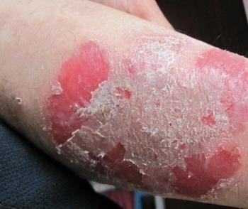 红皮病型银屑病患者会在原有的皮损部位出现皮肤潮红,然后逐渐扩大,并有轻度水肿或浸润,皮肤大多干燥,少数可呈湿润结痂,同时伴严重瘙痒。当皮损缓解时可出现大量脱屑,头面部因皮脂多或继发感染而鳞屑较厚腻,掌跖部常呈大片脱皮。在红皮病型银屑病疾病初发时,在患者的皮损部位出现潮红,后迅速扩散到大片,直至全身呈现弥漫性潮红浸润,同时在在弥漫性潮红浸润中,常有片状正常“皮岛”。